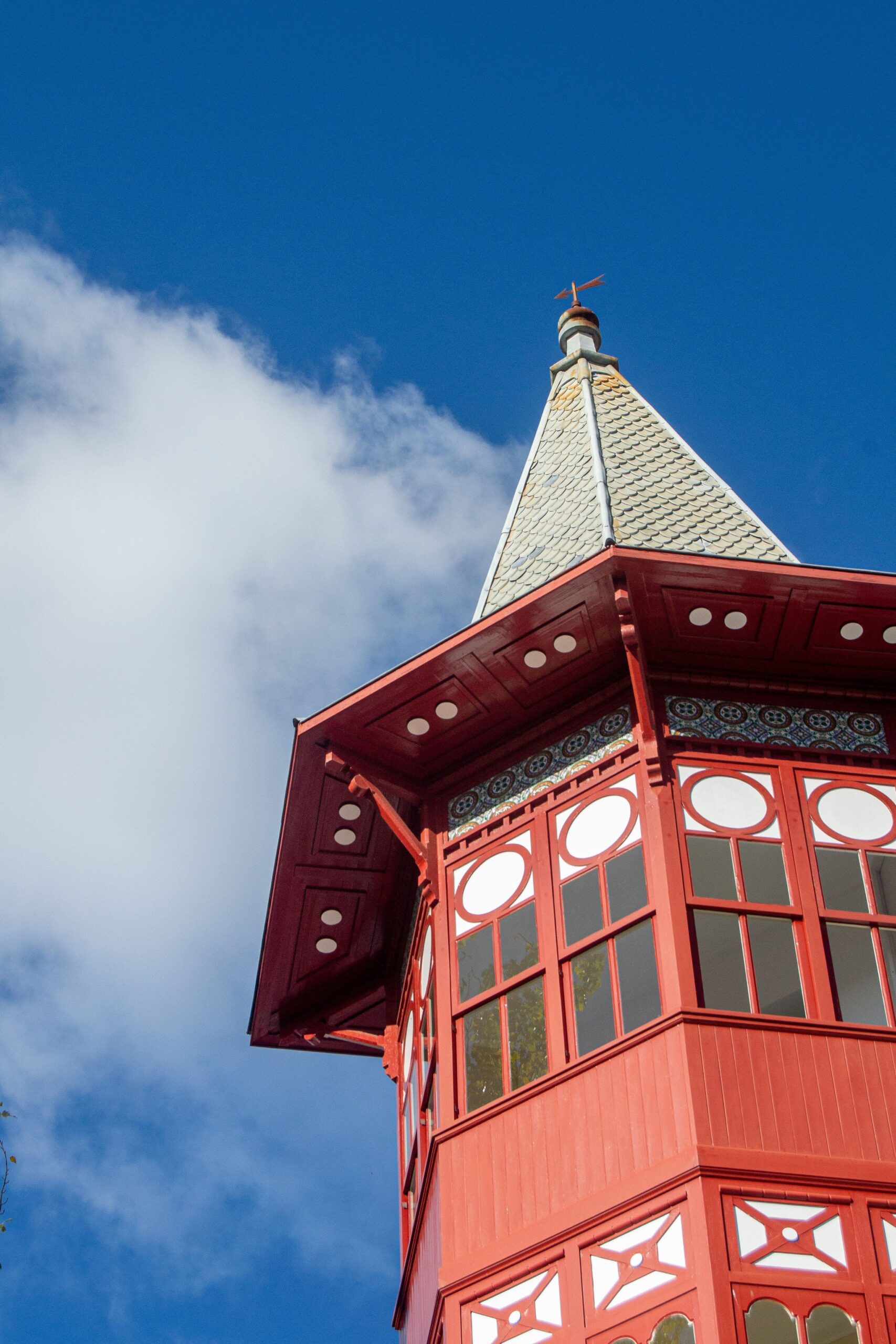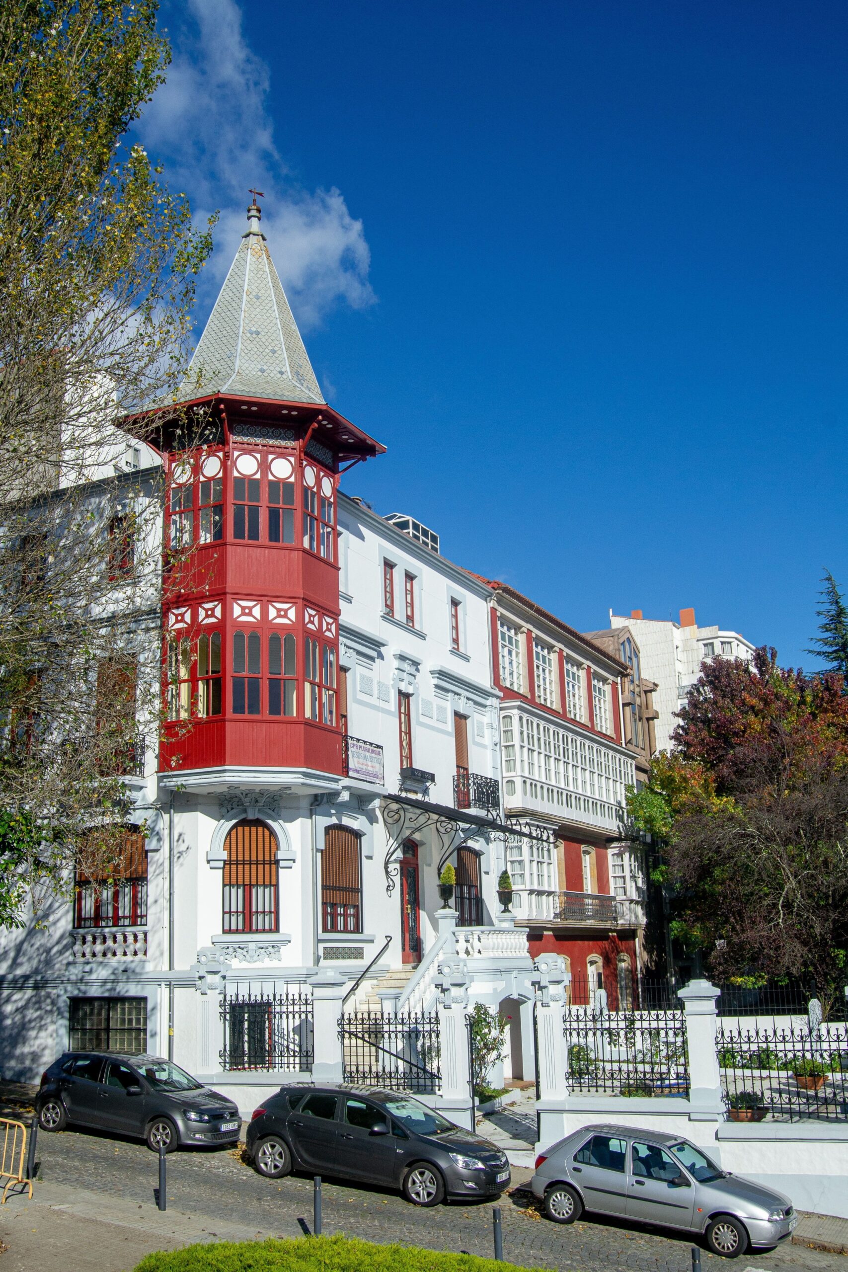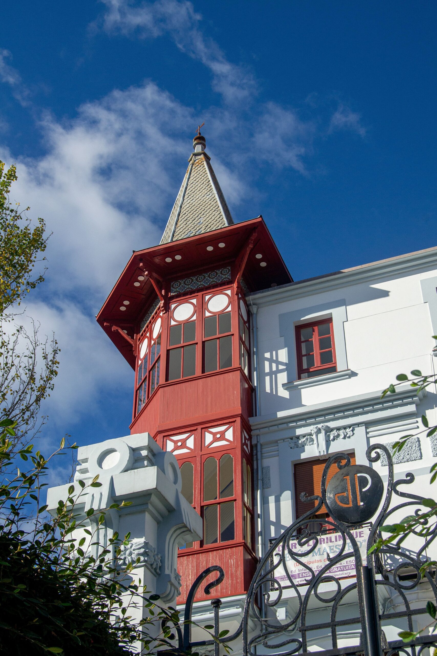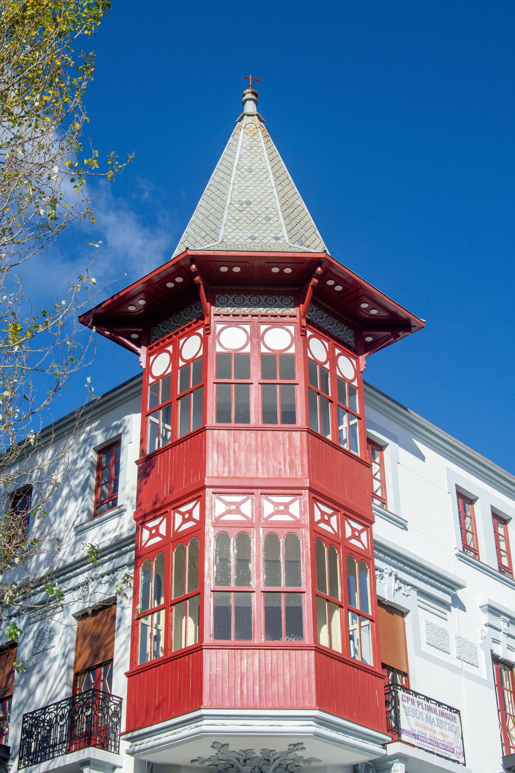 El elemento característico de este proyecto de Rodolfo Ucha Piñeiro será original mirador de planta hexagonal volado a partir del chaflán de la planta baja, sobreelevado por encima de la línea de cornisa, provisto de un minucioso y complejo despiece de su carpintería, y coronado por un espectacular chapitel que lo hace pasar por un fantasioso y casi literario torreón excéntrico.